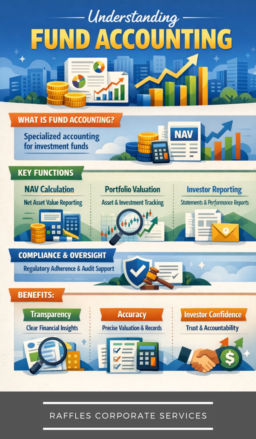 Fund accounting is a specialised accounting method used to track the financial position and performance of investment funds. In Singapore, it focuses on net asset value (NAV), investor subscriptions and redemptions, and portfolio valuation. As a result, it differs significantly from traditional corporate accounting.