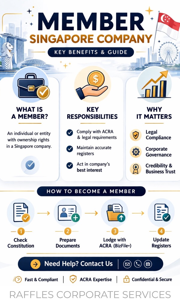 A member of a Singapore company is a person or entity whose name is entered in the company’s register of members. In most cases, a member is a shareholder who owns shares in the company and has legal rights under the Companies Act 1967.