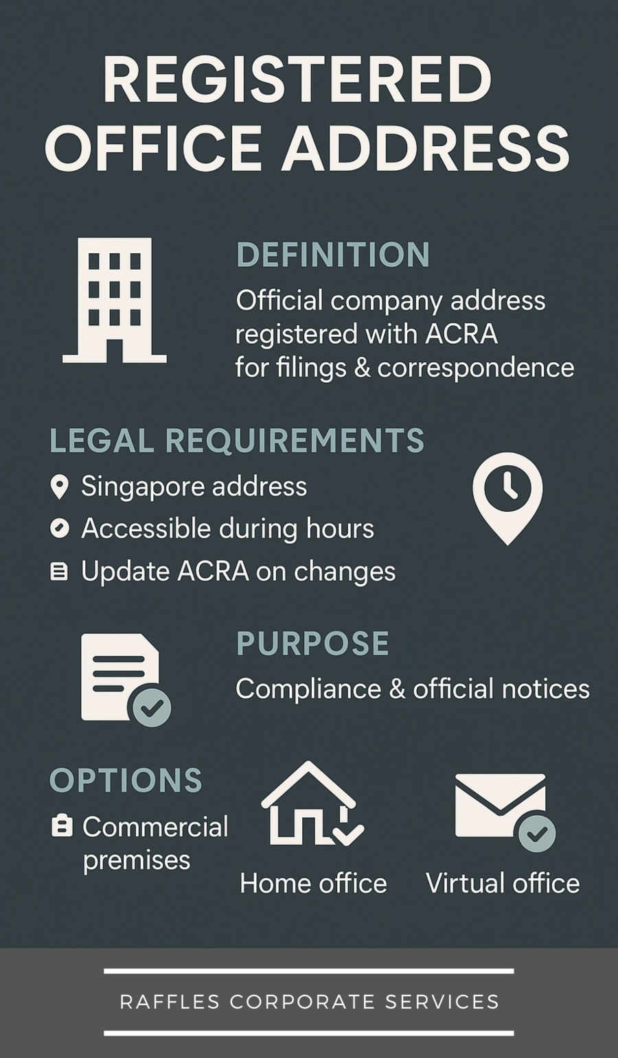 - Legal Requirement: Companies in Singapore are required by law to have a registered office address where official documents, notices, and correspondence from government agencies and regulatory bodies can be sent and received.