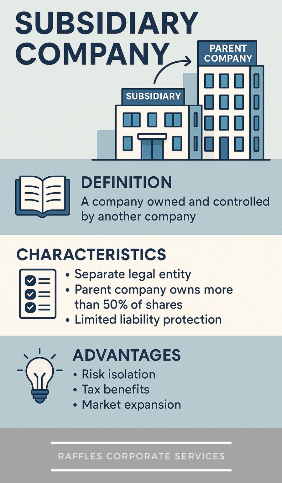 Separate Legal Entity: A subsidiary is legally distinct from its parent and can own assets, incur liabilities, and enter into contracts under its own name. This allows liabilities or legal risks of the subsidiary to typically remain separate from the parent.