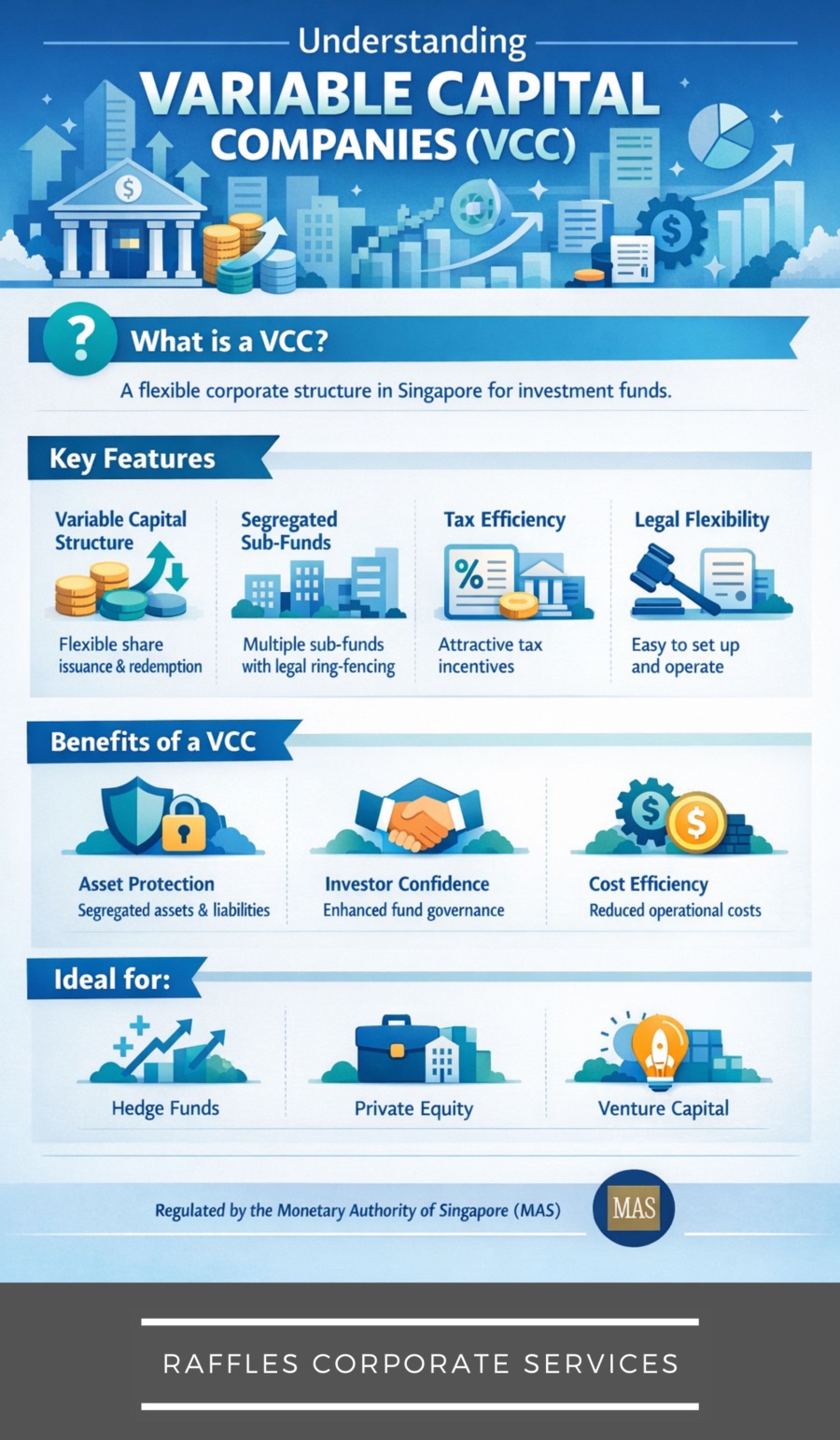 A VCC can be set up as a standalone fund or as an umbrella VCC with multiple sub-funds. Each sub-fund can have different investment strategies and investors.