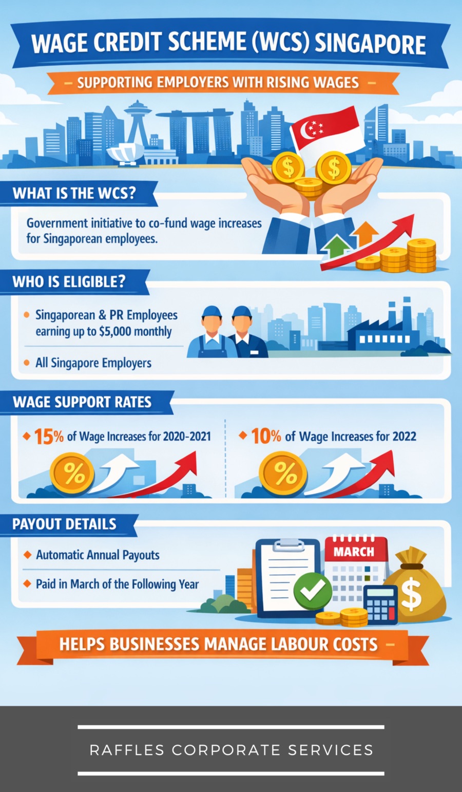 The Wage Credit Scheme (WCS) is a Singapore government programme that co-funds wage increases for eligible local employees. Under the scheme, the Government shares part of the cost when employers raise wages. As a result, WCS encourages sustainable wage growth while helping businesses manage manpower costs.